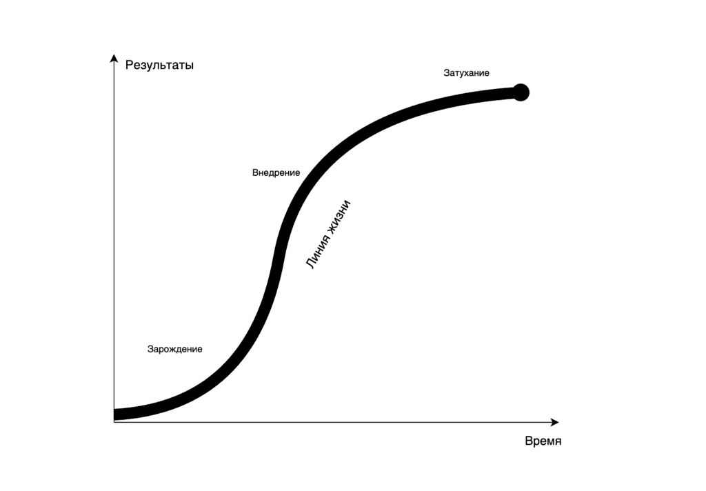 Большинство саморазвивающихся систем (биологических, экономических, технических, организационных и др.) следуют динамике логистической кривой (S-образной), также называемой Линией Жизни, проходя фазы зарождения, роста, затухания и возможного перехода на новый уровень.