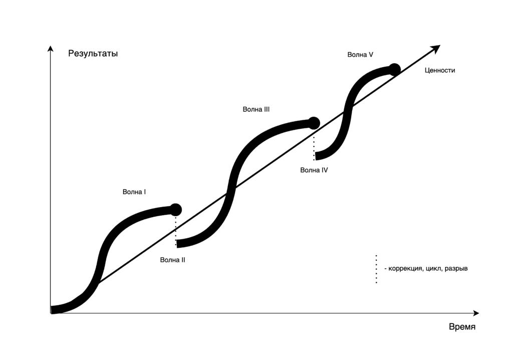 Каждая линия жизни развивается в рамках волнового плана, соединяясь с другими линиями через периоды корректировок, технологических изменений и адаптаций в производственных циклах. Эти соединения позволяют системе оставаться гибкой, не разрушая уже накопленные результаты. Например, волновой план можно представить через простейшую метафору календарных недель: начало и конец недели характеризуются спадом продуктивности, а её середина — ростом. Аналогично в проектах возникают фазы активного роста, периоды рефлексии и переходы к новым этапам.